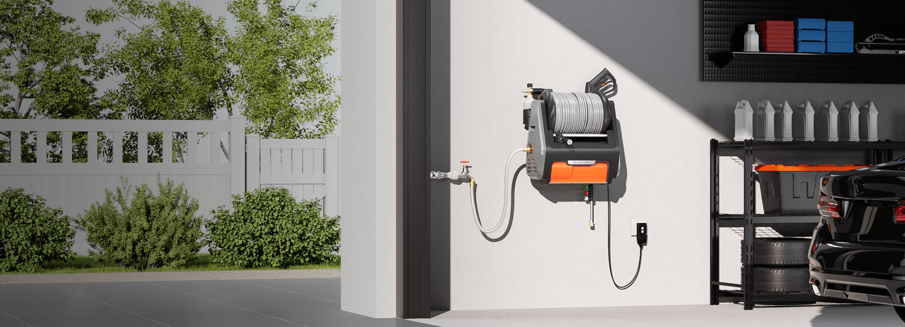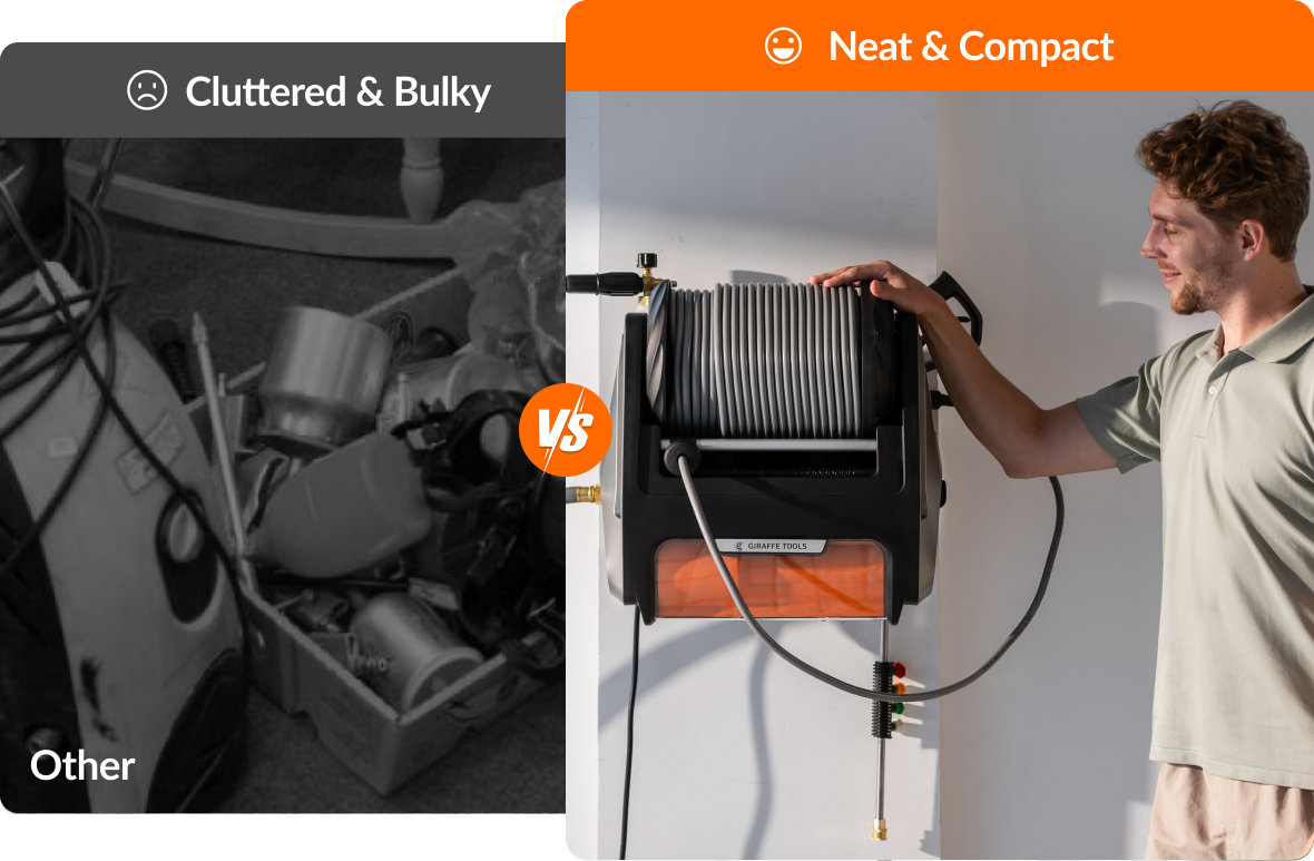 - Wall-Mounted, Fully Organized: Keep your space clean and clutter-free. The wall-mounted design lifts the unit off the ground, while built-in storage compartments hold the hose, spray gun, and nozzles—all in one place. Enjoy the sense of order!