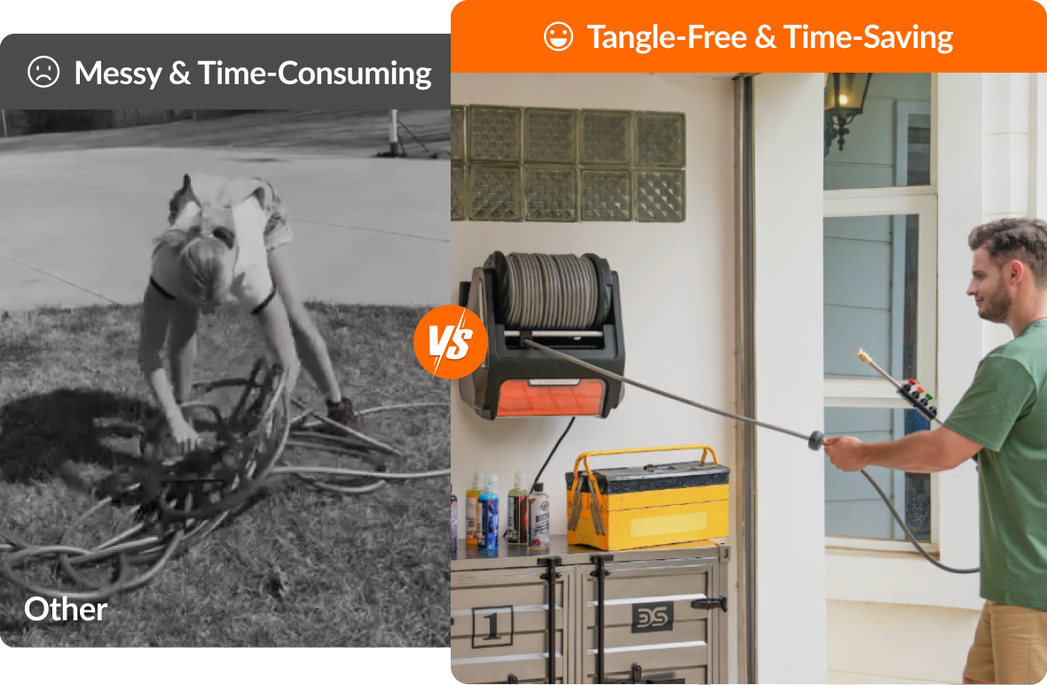 You don't have to bend down and tidy up the messy hose after you finish cleaning. Simply give the hose a light pull and it will automatically arrange itself neatly.