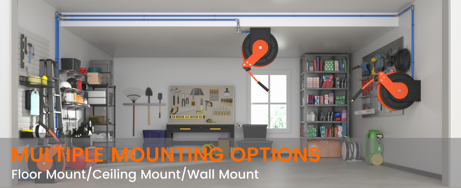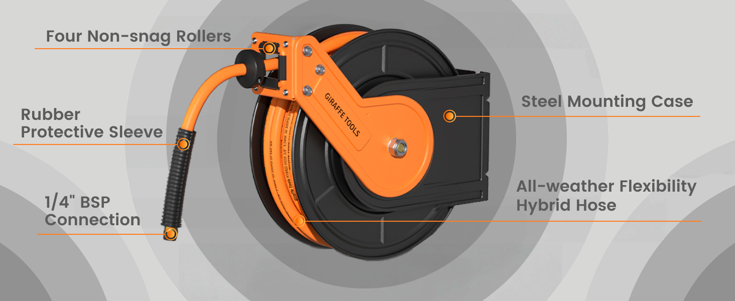 • Automatic Rewind Hose Guide: Simply give the hose a gentle tug and the air compressor hose reel will retract all the way back in without kinks. Equipped with a hose guide system makes the hose fits neatly on the reel.