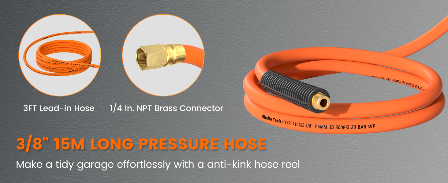 • Premium Retractable Air Hose: 15m(50ft) oil and abrasion-resistant air hose, this all-weather flexibility Hybrid hose(-40 to 150℉ temperature range)is perfect for year-round use, even in the cold winter.
